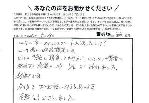 | こんなに安いステンレスプレートがあったとは! という感じの価格設定です。 ビルの管理を請負ってますが、ビルメンテ業者に発注する金額の約四分の一で済みました。感謝です。 今後もお世話になると思います。 有難うございました。 |