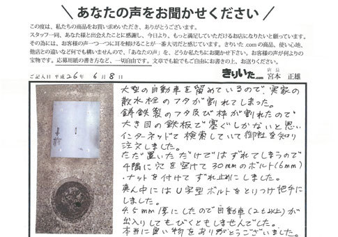 | 大型の自動車を留めているので、実家の散水栓のフタが割れてしまった。 鋳鉄製のフタ及び枠が割れたので大き目の鉄板で塞ぐしかないと思いインターネットで検索していて御社を知り注文しました。 ただ置いただけではずれてしまうので4隅に穴を空けて30mmのボルト(6mm)・ナットを付けてずれ止めにしました。 真ん中にはU字型ボルトを取り付け把手にしました。 4.5mm厚にしたので自動車(2t以上)が出入りしてもびくともしませんでした。 本当に良い物をありがとうございました。 |