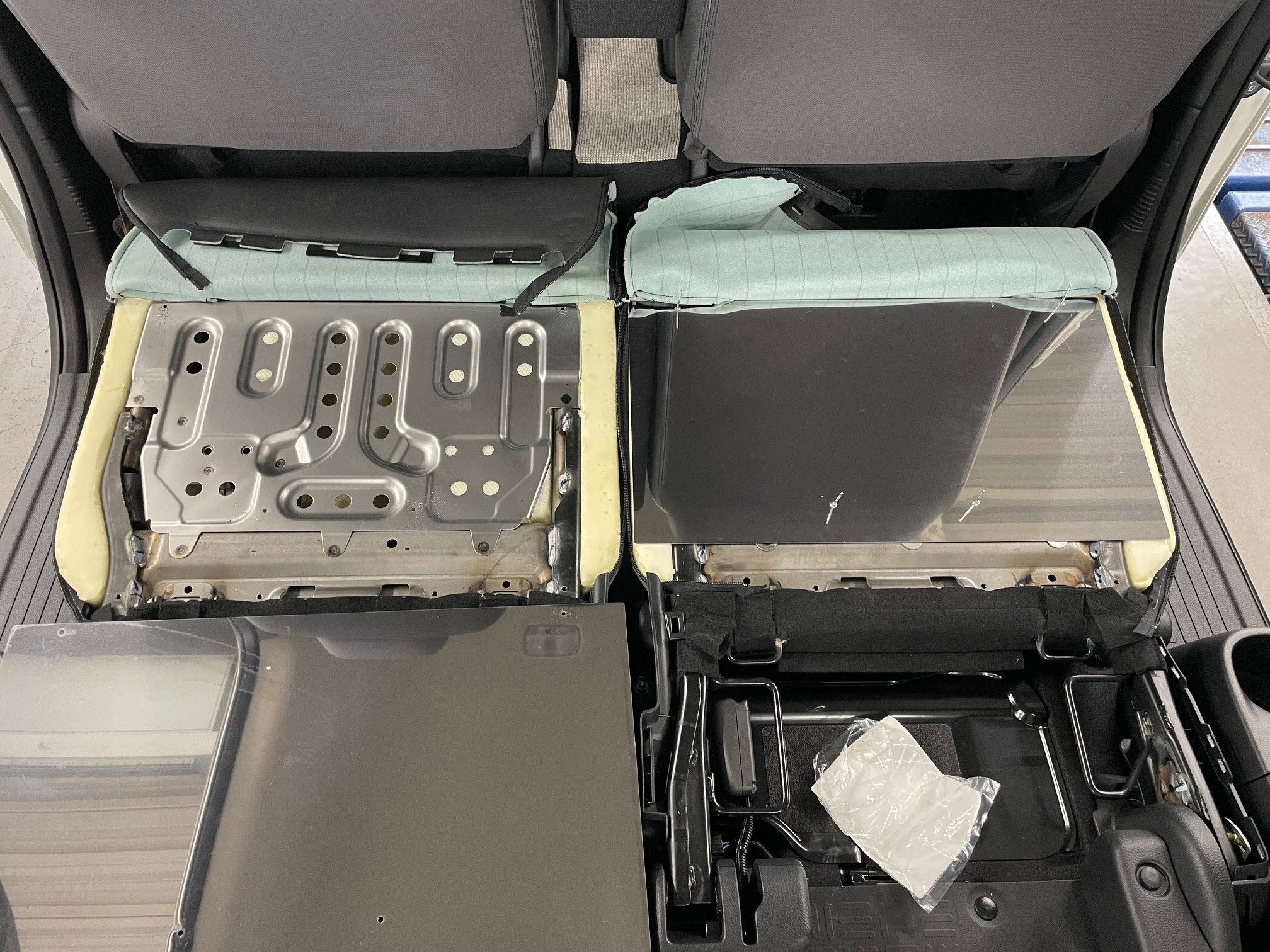 N-BOXスロープ(車いす仕様車)のリアシート背もたれを倒した荷室部分に重い荷物を載せるため補強に用いました。(リベット固定)